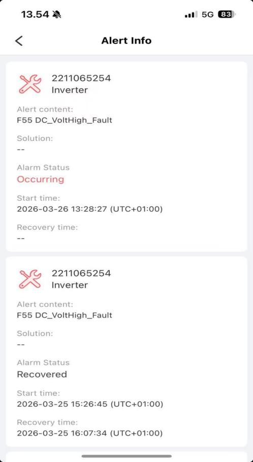 Bu durumda, konutsal PV depolama sistemi gündüz yüksek ışınımlı dönemlerde ihracatı tekrar tekrar durdurmuştur. Uzaktan izleme alarmları artırdı. Üçü açık - site ekran görüntüleri eksiksiz bir kanıt zinciri oluşturur ve temel sorunu açıkça gösterir: