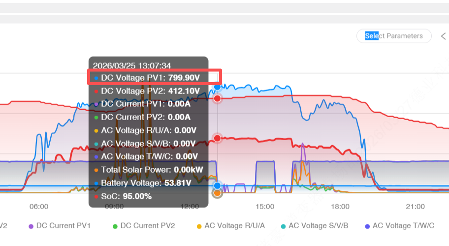 Bu durum tipiktir: PV1 dizi serisi sayısı çok yüksek olduğundan açık devre voltajı 799,90 V'a ulaşarak invertörü çok aşıyor ' izin verilen giriş. Güçlü ışınım altında aşırı gerilim koruması kaçınılmaz olarak tetiklenir. Bazı durumlarda modül tipinde veya dizi sayısında PV1 ve PV2 arasında dengesizlik de görülerek bir dizinin güvenli voltajı aşmasına neden olur.