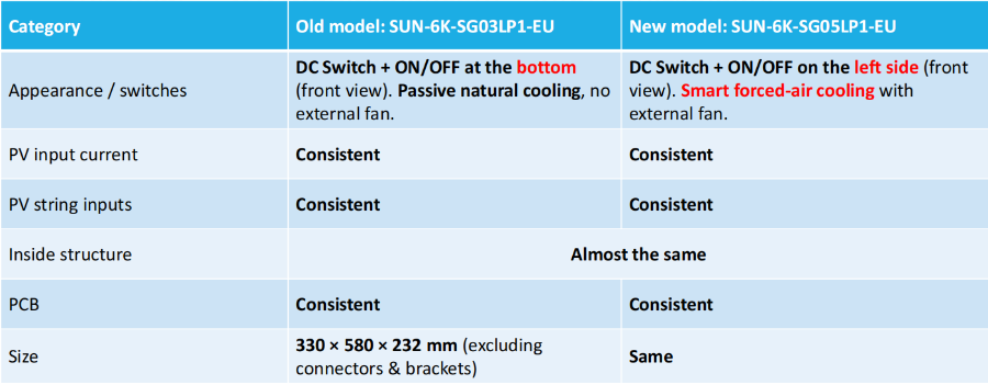 Eski modelden (SUN-6K-SG03LP1-EU) Yeni modele (SUN-6K-SG05LP1-EU) geçiş, basınçlı hava soğutmasının ve daha erişilebilir anahtar düzeninin eklenmesiyle soğutma ve kullanıcı arayüzü tasarımındaki gelişmeleri yansıtıyor. Bu değişiklikler invertörün hem performansını hem de kullanım kolaylığını artırır. Ancak kurulumu yapanların yeni harici fandan kaynaklanan potansiyel gürültü etkisini hesaba katması ve verimli hava akışı için uygun açıklık sağlaması gerekir. Temel elektrik bileşenleri ve boyutları büyük ölçüde değişmeden kalır ve kurulumlarda süreklilik ve uyumluluk sağlanır.